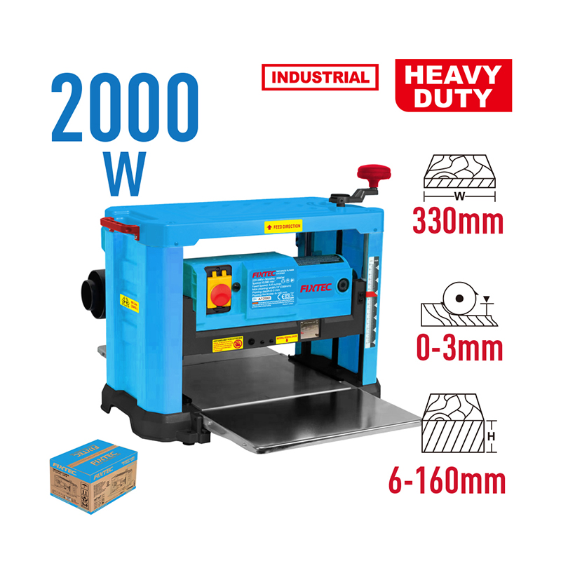 FIXTEC Tools offers a sturdy 2000W 13-inch thickness wood planer suitable for long, intensive work periods, designed for professional workers in industrial applications. It supports processing wood of different widths and thicknesses and can be connected to a dust collection system to maintain a clean working environment. This power thickness planer can be used in conjunction with table saws, sanders and other equipment to form an efficient processing flow. Welcome to place bulk orders and OEM orders for our thickness planers. We offer samples for distributors, wholesalers and brand owners, allowing you to try its performance and then support your company, retail store or woodworking shop.